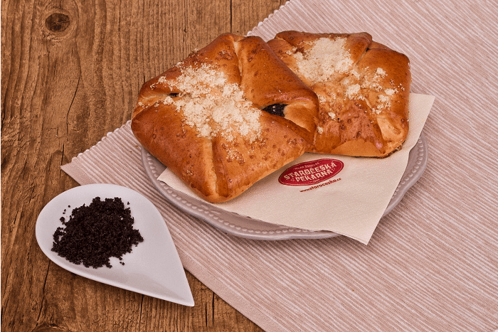 Rohlík ze sladkého kynutého těsta, sypaný mákem.