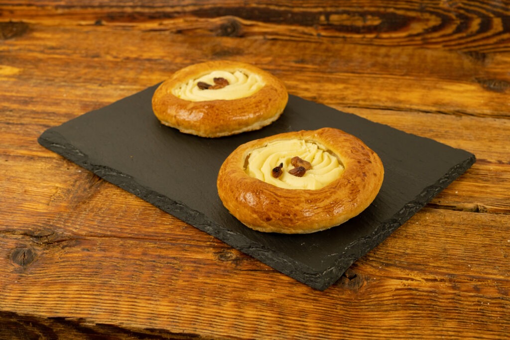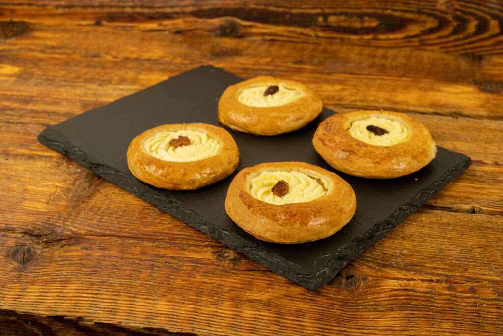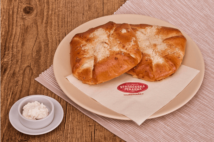 Třené máslové těsto plněné tvarohovou náplní (pšeničná mouka, mléko, vejce, syrovátka).