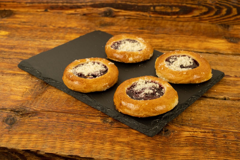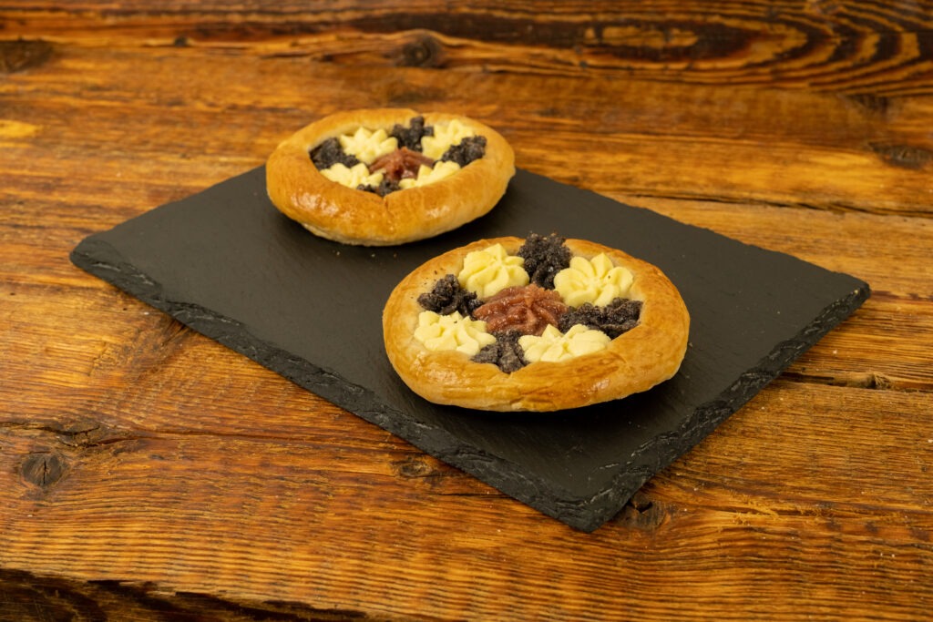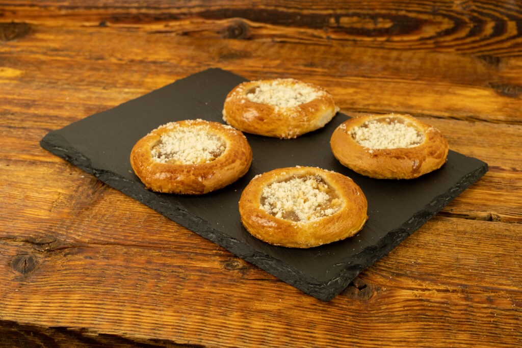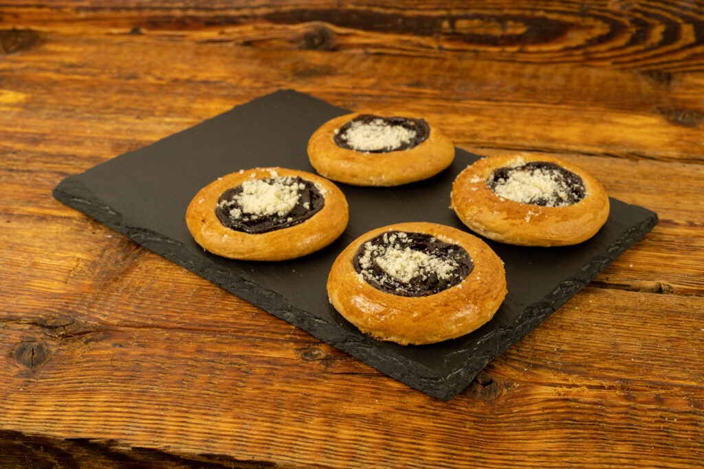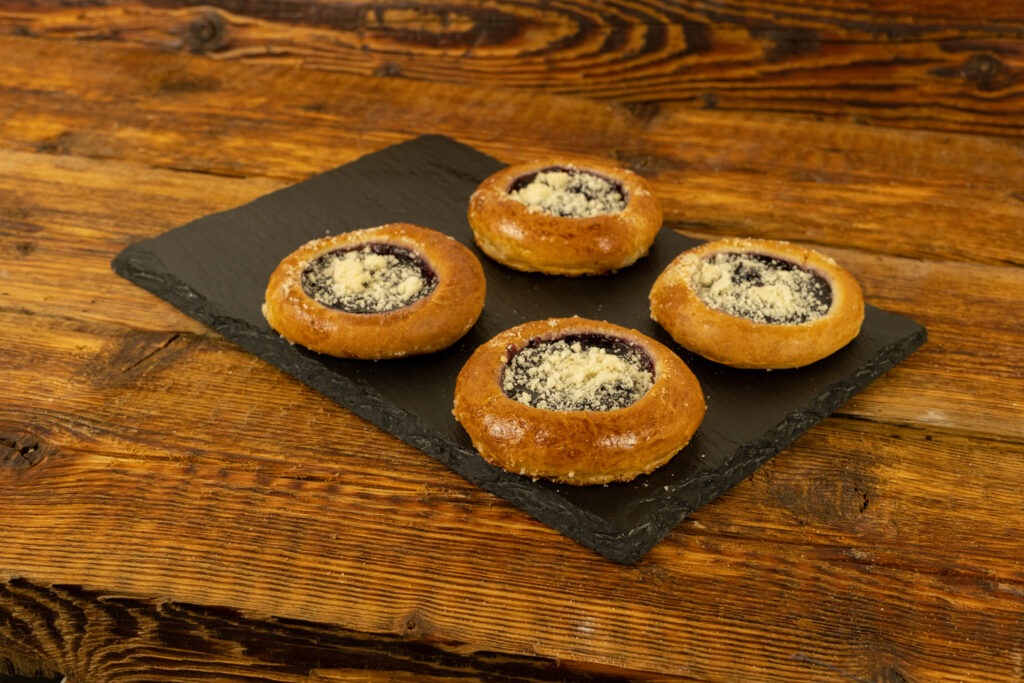 Tlačený koláček s tvarohovou, makovou, jablečnou a ovocnou náplní.