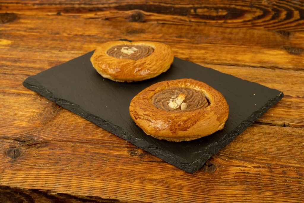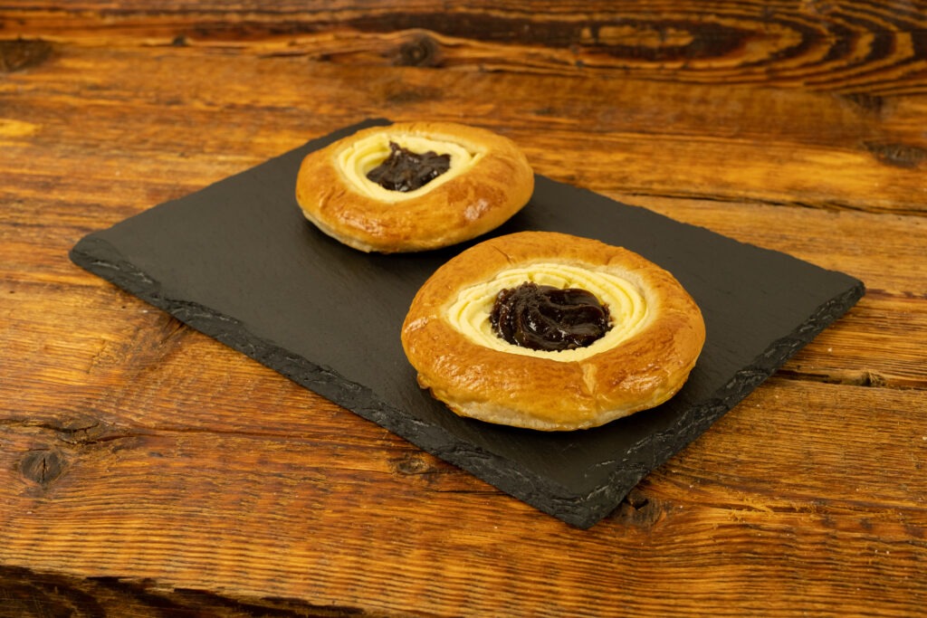 Třené máslové těsto plněné povidly (pšeničná mouka, mléko, vejce, syrovátka).